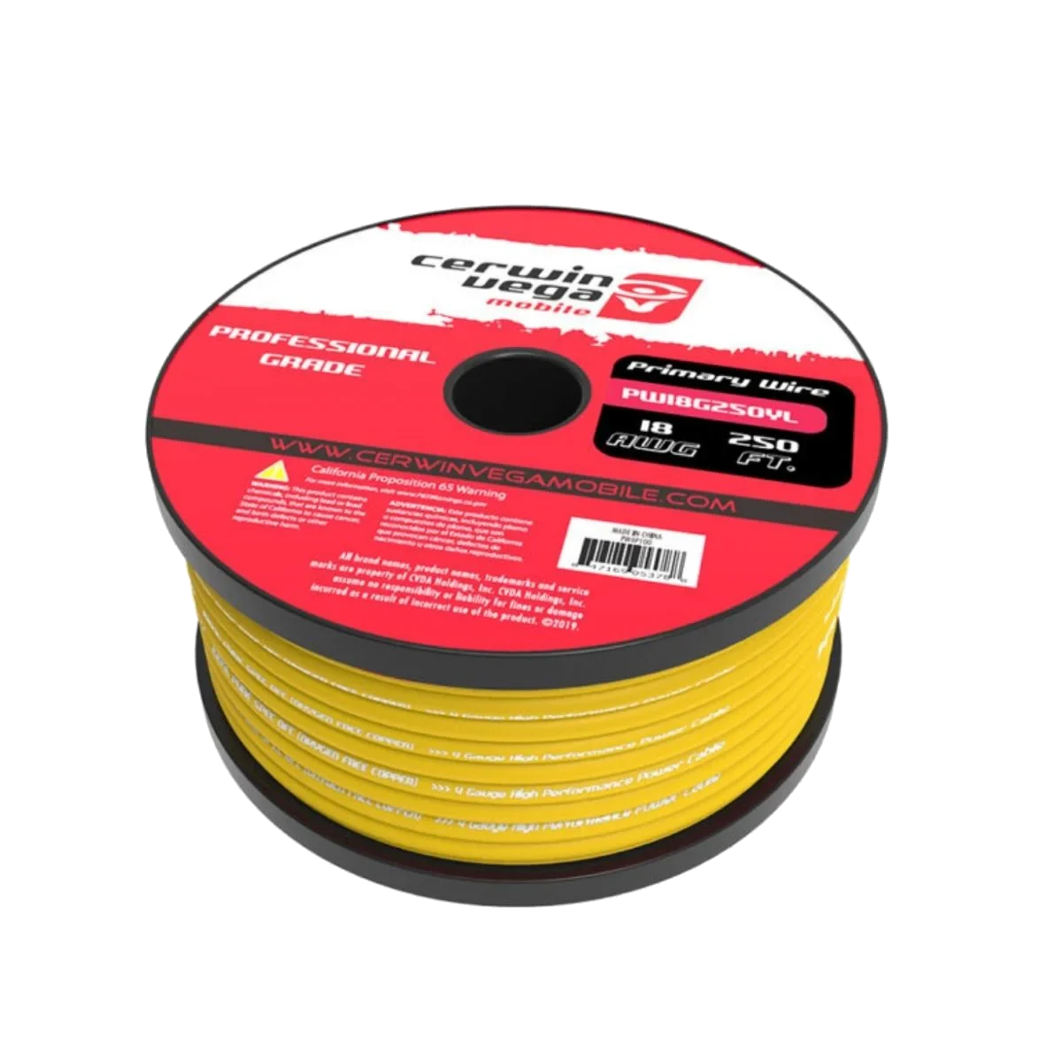 PW18G250YL - CERWIN-VEGA 18 Gauge Primary Wire Description: Cerwin-Vega's Oxygen Free Copper Power Wire is ideal for sound system installation needs. The different Gauge sizes we carry will allow you to work on basic sound system to competition quality systems.