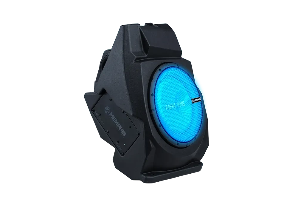 Memphis Audio direct fit OEM Powered 10” subwoofer enclosures fit directly into your vehicle with zero custom fabrication required. The HDPE rotomolded subwoofer enclosures is extremely durable and tuned for maximum output and performance. The enclosure has a built in marine grade amplifier designed to pair perfectly with the 10” subwoofer to produce thunderous bass on the trails. RZR powered subwoofer enclosures are the best way to add a subwoofer to your Polaris RZR PRO. This unit features a brilliant backlit RGB LED cone which creates an awesome light show at night.