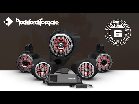 The system is element-rated for off-road exposure (water, dirt, mud, UV) and carries an IPX6 water intrusion rating. The Stage 6 for Ride Command uses Ride Command as the source and provides options to add front/rear Color Optix speakers and a subwoofer on select models. Installation is intended to be plug-and-play wi…